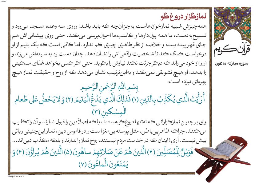 آیا دیدى آن کسى را که دین را دروغ مى¬انگارد؟ (1) [شاید در زبان چنین نباشد، اما رفتارهایی دارد که جز از مکذّب دین سر نمی¬زند.] او همان کسى است که یتیم را به شدت و ستم از خود مى¬راند (2) و بر اطعام بینوا ترغیب نمى¬کند. (3) [هرچند در میان نمازگزاران است، اما نمازگزار درستی نیست. اگر بود، نمازش او را از دنیاگرایی و تبعات زشت آن باز می¬داشت.] پس واى بر این نمازگزاران! (4) همانان که از نمازشان غافلاند و بدان اهتمام نمی¬ورزند. (5) همانان که ریا مى¬کنند (6) و از اموال خویش در رفع نیاز دیگران دریغ می-کنند. (7)